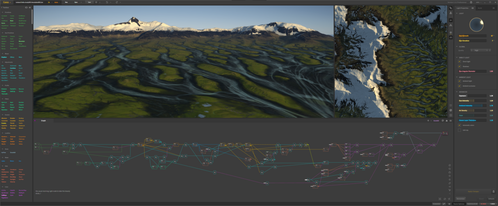 A complex 125 nodes fully annotated project that blends in so many ways the flows and deposits from different nodes that gives out these datas. All that to create the majestic Iceland deltas we love to see in so many nice photographs from there.